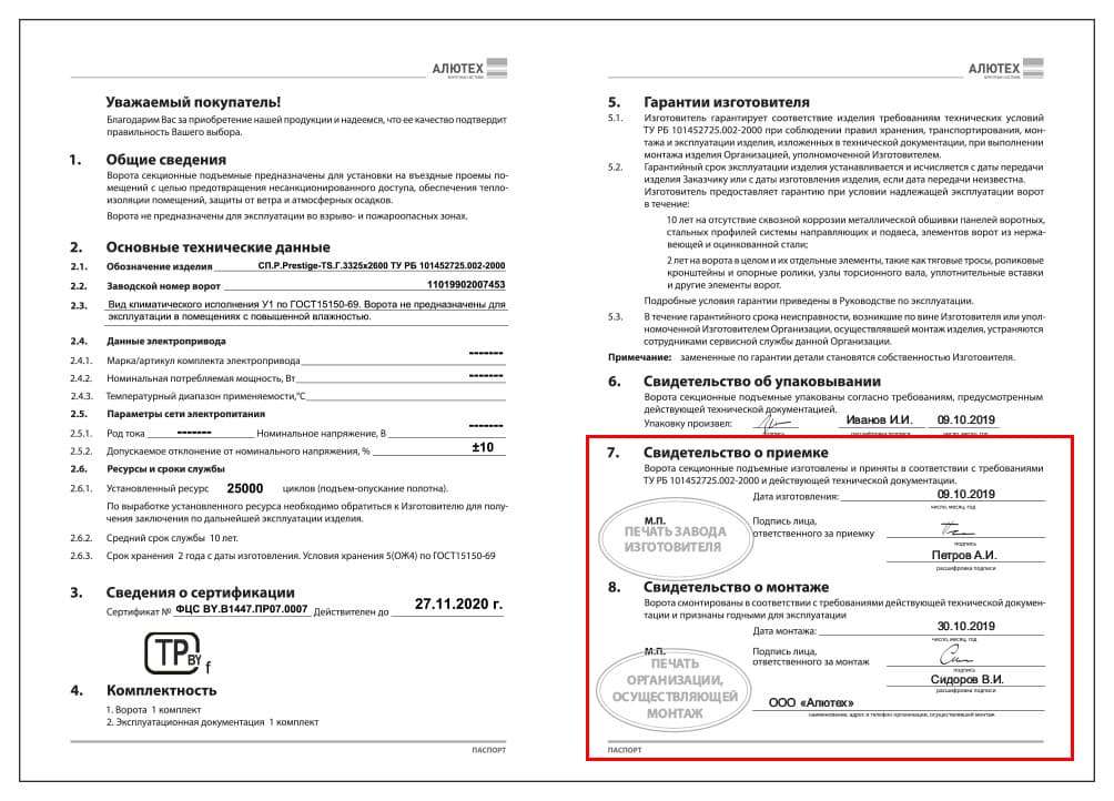 6. Получите от представителя монтажной бригады документы на ворота: руководство по эксплуатации, паспорт изделия с отметкой даты монтажа и печатью организации-установщика.